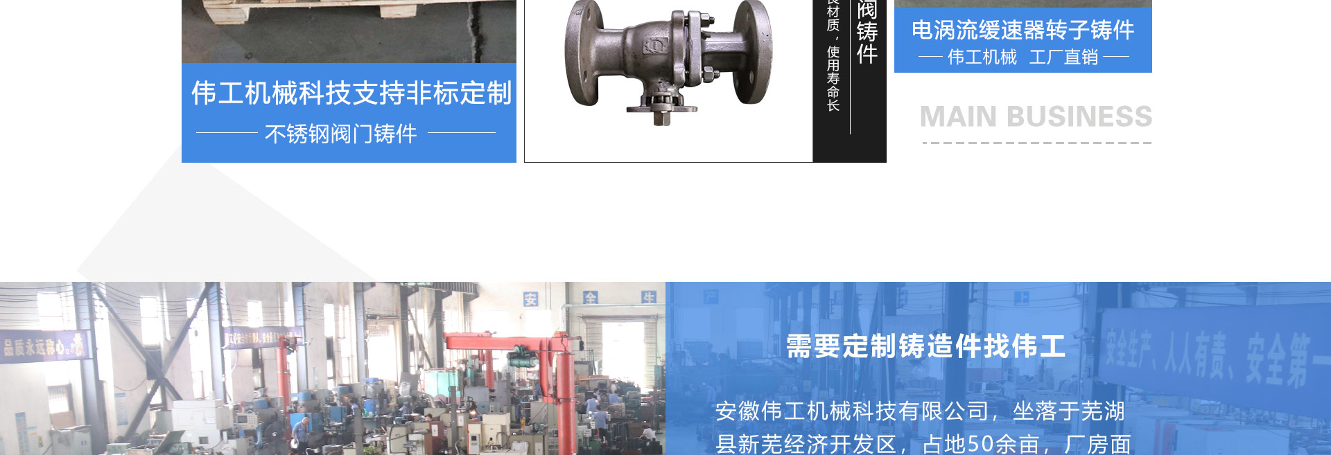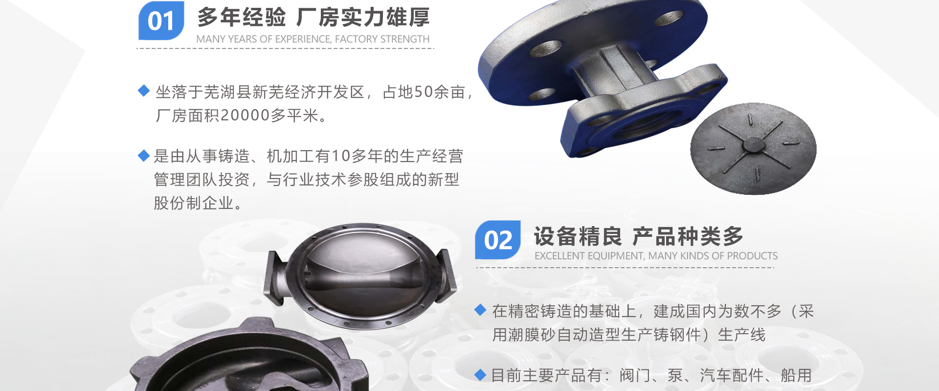 安徽偉工機(jī)械科技有限公司,坐落于安徽蕪湖新蕪經(jīng)濟(jì)開發(fā)區(qū),是一家専業(yè)從事鑄造產(chǎn)品設(shè)計(jì)、研發(fā)、生產(chǎn)、銷售于一體的企業(yè),公司為客戶的產(chǎn)品提供多樣的技術(shù)支持與設(shè)計(jì),公司主要鑄造技術(shù)有潮模砂鑄造、硅溶膠精鑄工藝。主要產(chǎn)品有:不銹鋼閥門配件、泵閥配件、汽車配件、工業(yè)管道配件、工程機(jī)械配件、汽車配件等。材質(zhì)為:低合金鋼、304、316、316L、鉻鉬鋼、哈氏合金、碳鋼、雙相鋼等。公司已先后通過ISO9001和TS16949等多種體系審核,以完備的管理手段和齊全的檢測(cè)設(shè)備滿足客戶需求,進(jìn)的設(shè)備,専業(yè)的技術(shù),嚴(yán)謹(jǐn)?shù)墓芾?,穩(wěn)定的質(zhì)量。服務(wù)客戶,鑄造未來(lái),偉工誠(chéng)摯的歡迎新老客戶共同商洽合作